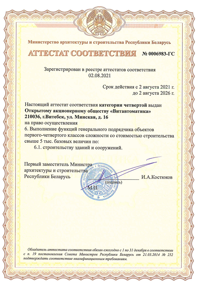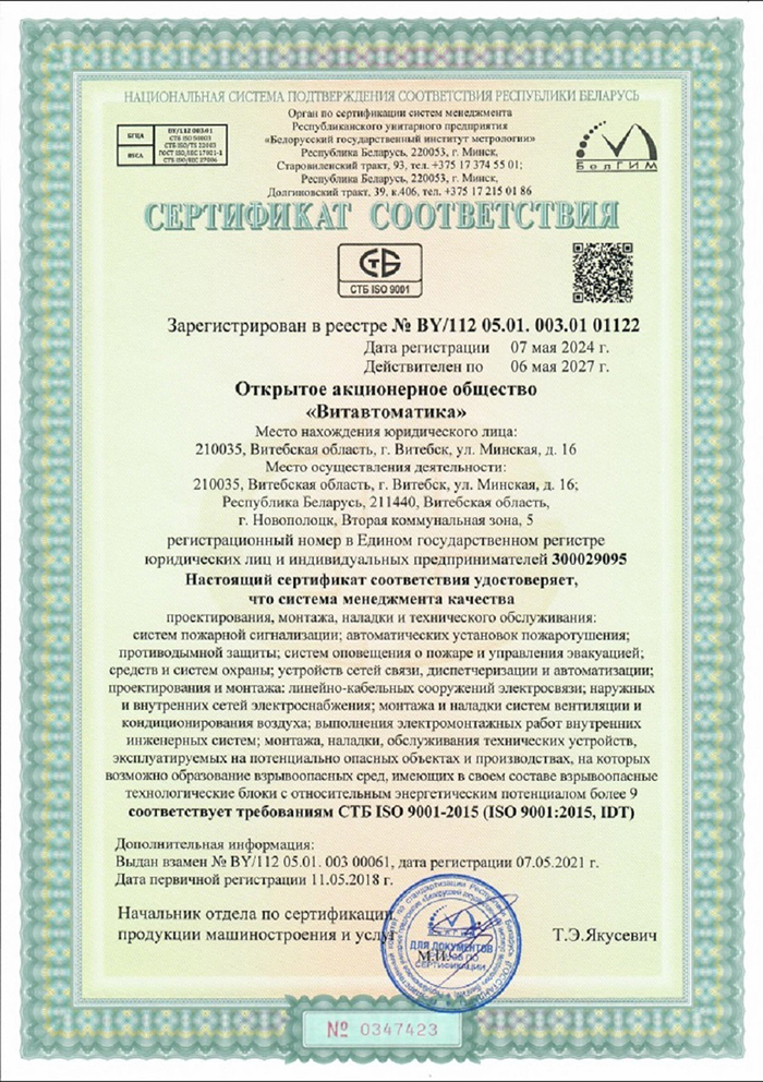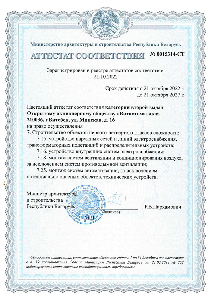 ОАО "Витавтоматика" занимает приоритетное положение на рынке предоставляемых услуг в сфере проектирования, монтажа и технического обслуживания систем безопасности и электроснабжения. Компания придает особое значение эффективному развитию и рациональному использованию ресурсов, необходимых для качественного выполнения работ. Соблюдение требований технических нормативных актов и законодательных норм является неотъемлемой частью нашей деятельности. Каждый работник компании понимает важность интересов заказчика, что позволяет нам устанавливать взаимовыгодные отношения с нашими партнерами и поставщиками.